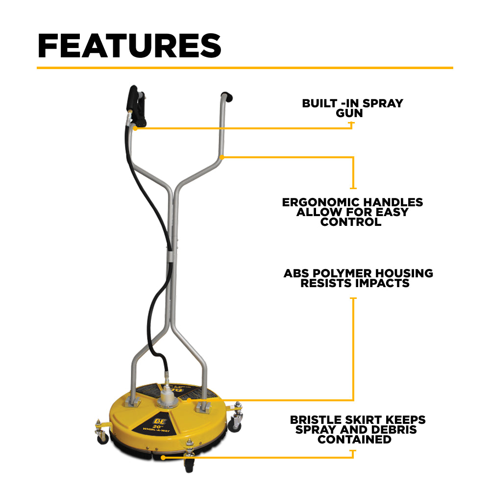 The 20" Whirl-A-Way Surface Cleaner is a high-capacity pressure washer attachment designed for fast, streak-free cleaning across large flat surfaces. Featuring dual high-speed rotating jets and a 20-inch cleaning width, it delivers consistent results while significantly reducing cleaning time compared to a standard spray wand. Built with a lightweight ABS polymer housing, integrated trigger gun and four swivel casters, this model provides smooth maneuverability and durability for commercial and residential applications.