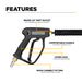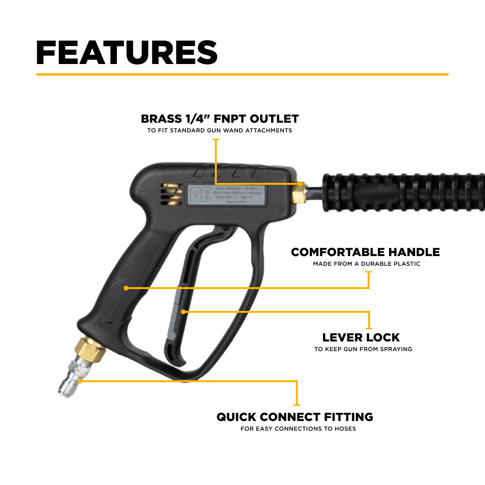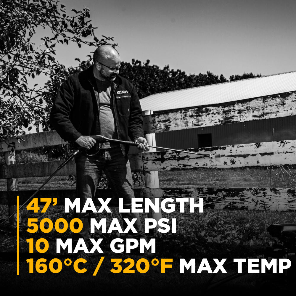 The 47" Pressure Washer Gun & Wand Assembly is a high-performance cleaning tool designed for extra reach, precision and control in demanding applications. Rated for up to 5,000 PSI and 10 GPM, it combines a commercial-grade spray gun with a 47-inch stainless steel wand—ideal for cleaning vehicles, building exteriors, equipment and large surfaces while keeping distance from the spray zone. With hot water compatibility up to 160°C / 320°F and universal quick-connect fittings, it delivers professional performance for industrial, commercial and residential use.