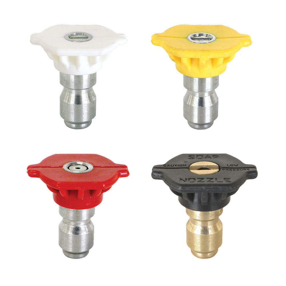 The Quick Connect Pressure Washer Nozzle Set (4.0 Orifice) provides professional spray control with four essential spray patterns for high-flow pressure washers. Designed for commercial-grade machines requiring larger orifice sizes, this set delivers consistent water volume, powerful cleaning performance, and fast switching between spray angles. Each tip includes a universal 1/4" quick-connect plug for quick changes on the job, along with durable stainless steel internals and color-coded housings for easy identification.