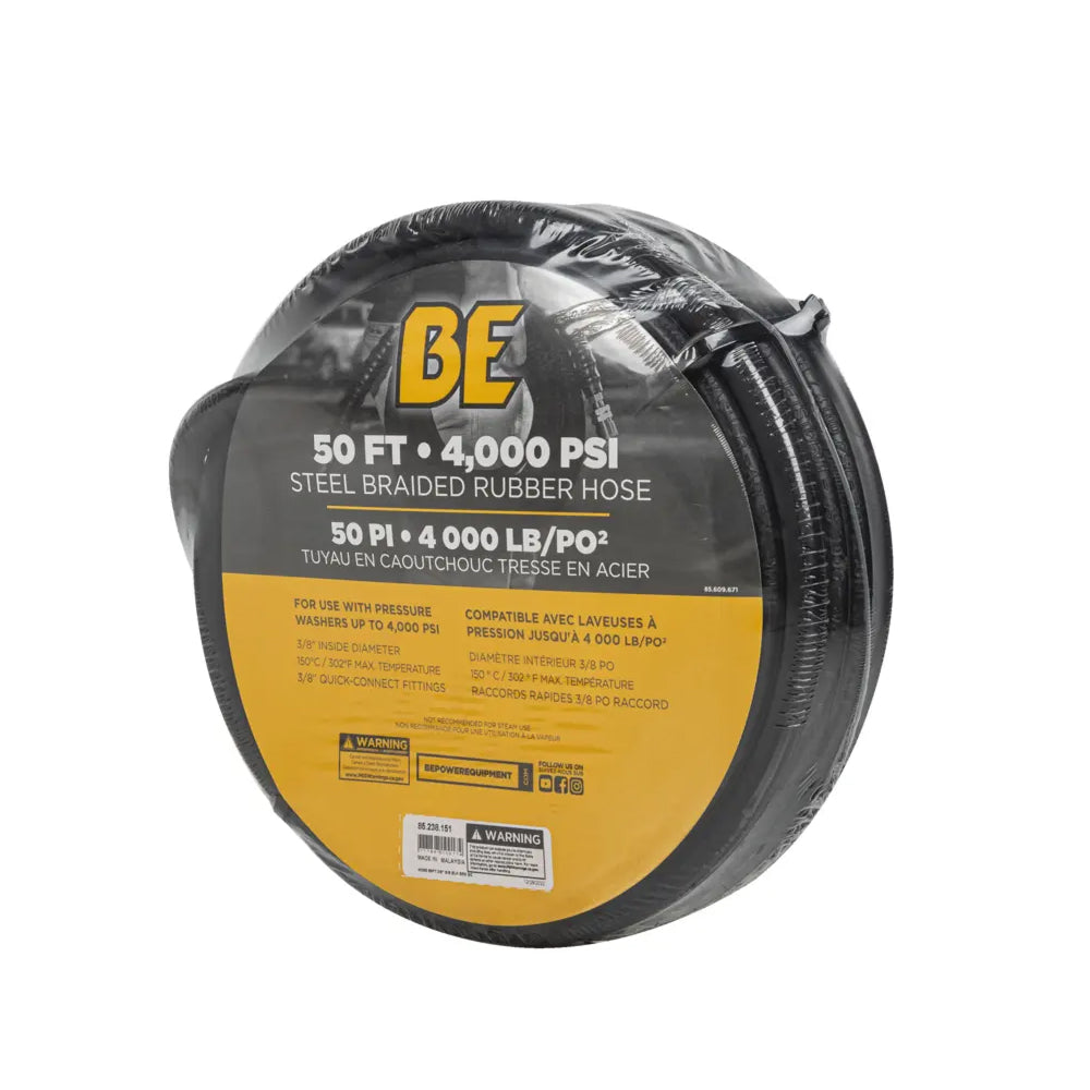 The 50' 4000 PSI 3/8" Pressure Washer Hose is built for professional and industrial cleaning applications requiring maximum durability, heat resistance, and consistent performance. Constructed from heavy-duty wrapped black rubber and reinforced for high-pressure systems, this hose supports working pressures up to 4,000 PSI and temperatures up to 149°C (300°F). Designed for hot and cold water use, it delivers strength, flexibility, and long-term reliability for demanding environments including fleet maintenance, equipment washdown, and commercial surface cleaning.