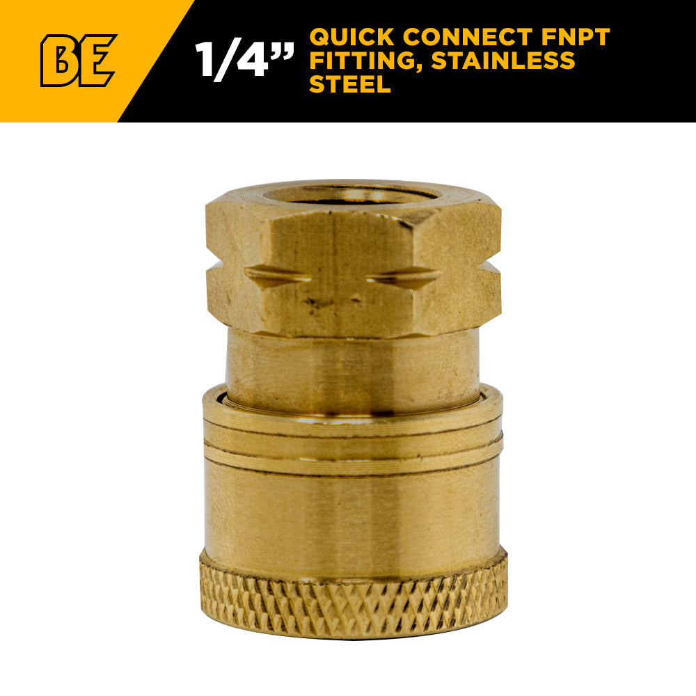 The 1/4" FNPT 4,000 PSI Quick Connect Brass Coupler is a durable, corrosion-resistant connector designed for secure and leak-free attachment in pressure washer systems. Made from solid brass, it provides reliable performance for switching between hoses, spray guns, wands, and accessories without tools. Rated up to 4,000 PSI, it’s suitable for residential, commercial, and light industrial cleaning setups that require consistent connection strength and long-term durability.