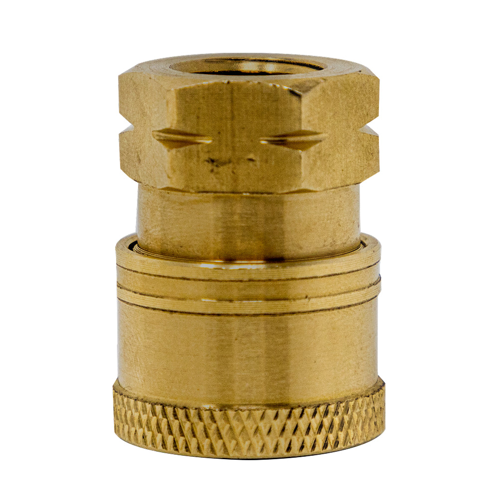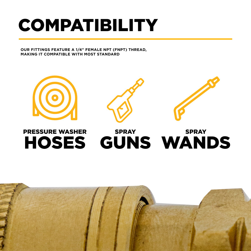 The 1/4" Quick Connect FNPT Brass Fitting is a durable and reliable connector designed for fast and secure attachment in pressure washing systems. Featuring a universal quick-connect mechanism and 1/4" female NPT threading, it allows hoses, spray guns, wands, and accessories to be connected in seconds while maintaining a tight, leak-free seal. Built from solid brass for corrosion resistance and long service life, this fitting is suitable for both residential and commercial pressure washer setups.