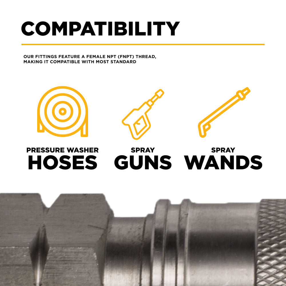 The 3/8" FNPT 6,000 PSI Quick Connect Stainless Steel Coupler is engineered for high-pressure cleaning systems that demand maximum durability and leak-free performance. Constructed from premium stainless steel, it offers exceptional corrosion resistance and strength for industrial, commercial, and marine environments. Designed for seamless connection between hoses, wands, spray guns, and accessories, this coupler provides reliable performance under continuous high-pressure use.