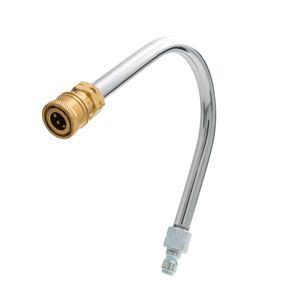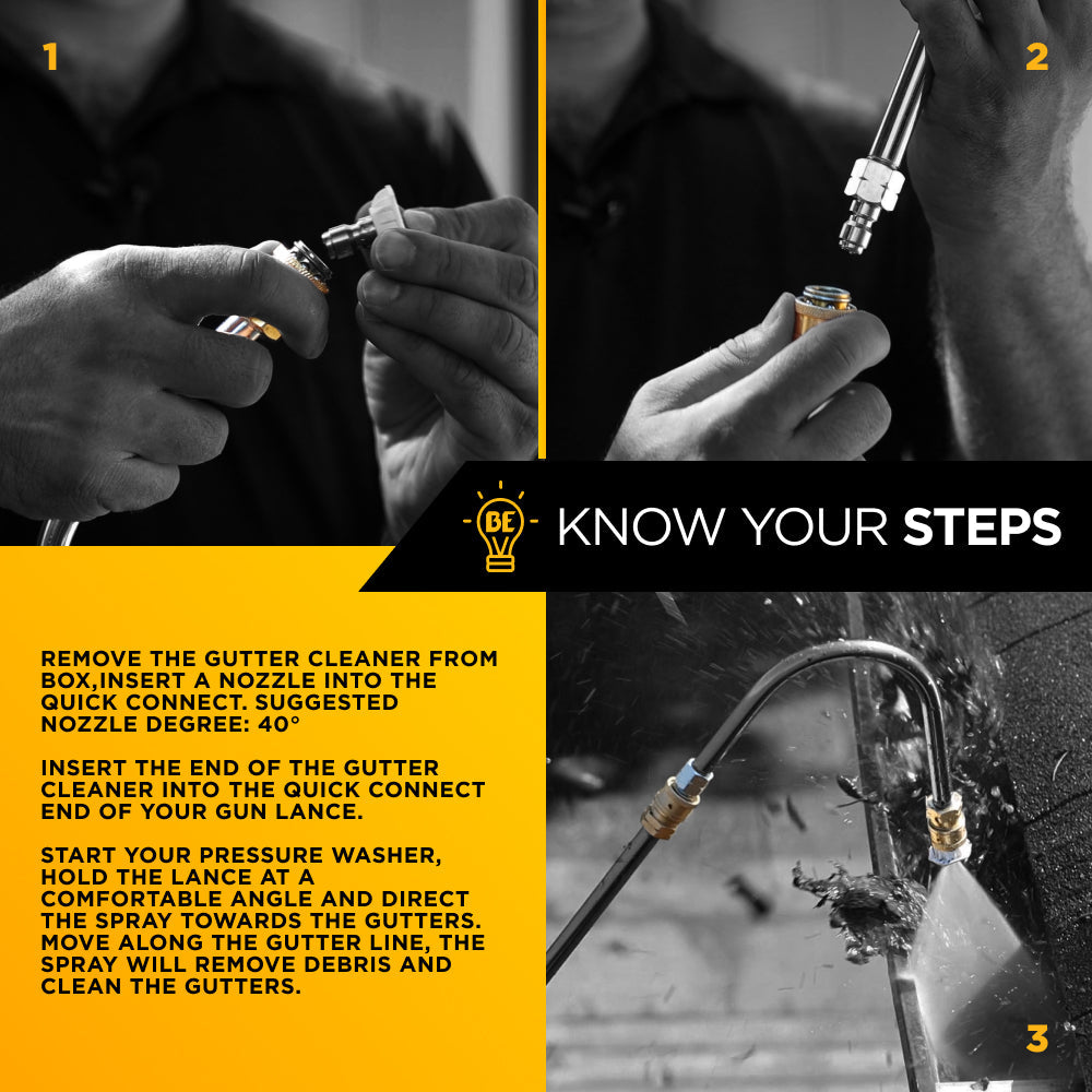 The 1/4" Quick Connect Gutter Cleaner is a durable, high-pressure attachment designed to clean gutters safely from the ground. Built from nickel-plated steel, it connects directly to the end of a pressure washer spray wand to flush out leaves, dirt and debris with a focused angled jet. With fast quick-connect setup and a compact, lightweight design, it provides efficient gutter maintenance for residential and commercial applications without using ladders or additional tools.