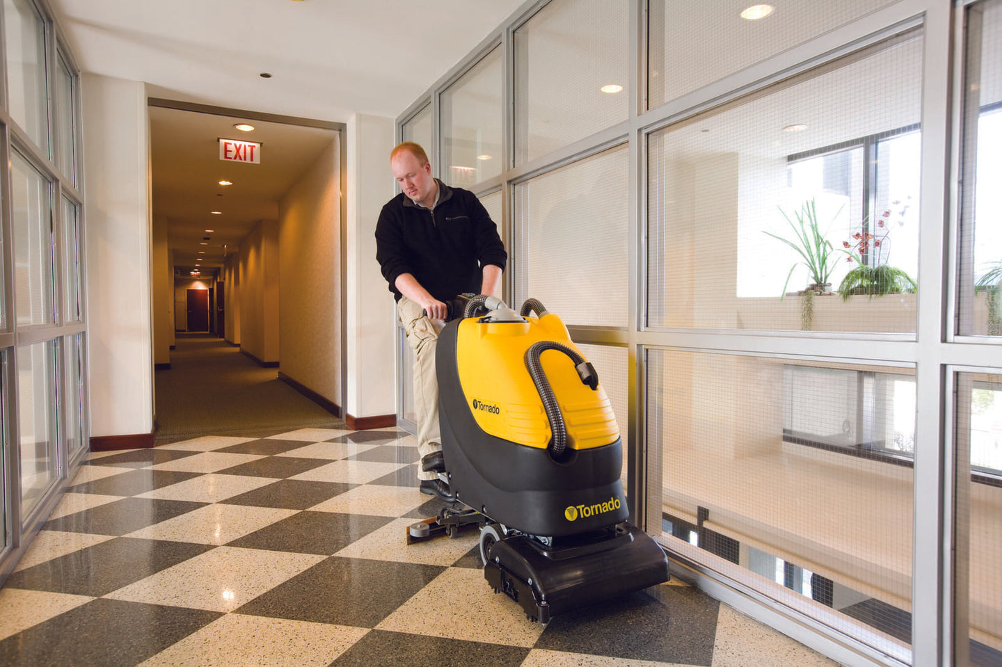 The Tornado® BR 18/11 is a compact cylindrical auto scrubber designed for tight and congested spaces where maneuverability and quiet operation are essential. With an 18" cleaning path and productivity of up to 17,969 sq. ft. per hour, this walk-behind unit provides effective hard-floor cleaning in areas that are too small for larger scrubbers but too demanding for manual methods.